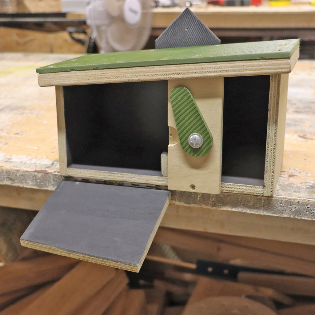 Monitoring/cleaning of the nest chamber is simply achieved via the hinged front panel. Once closed the panel is held securely in place with a swivel latch made from our recycled farm plastic.