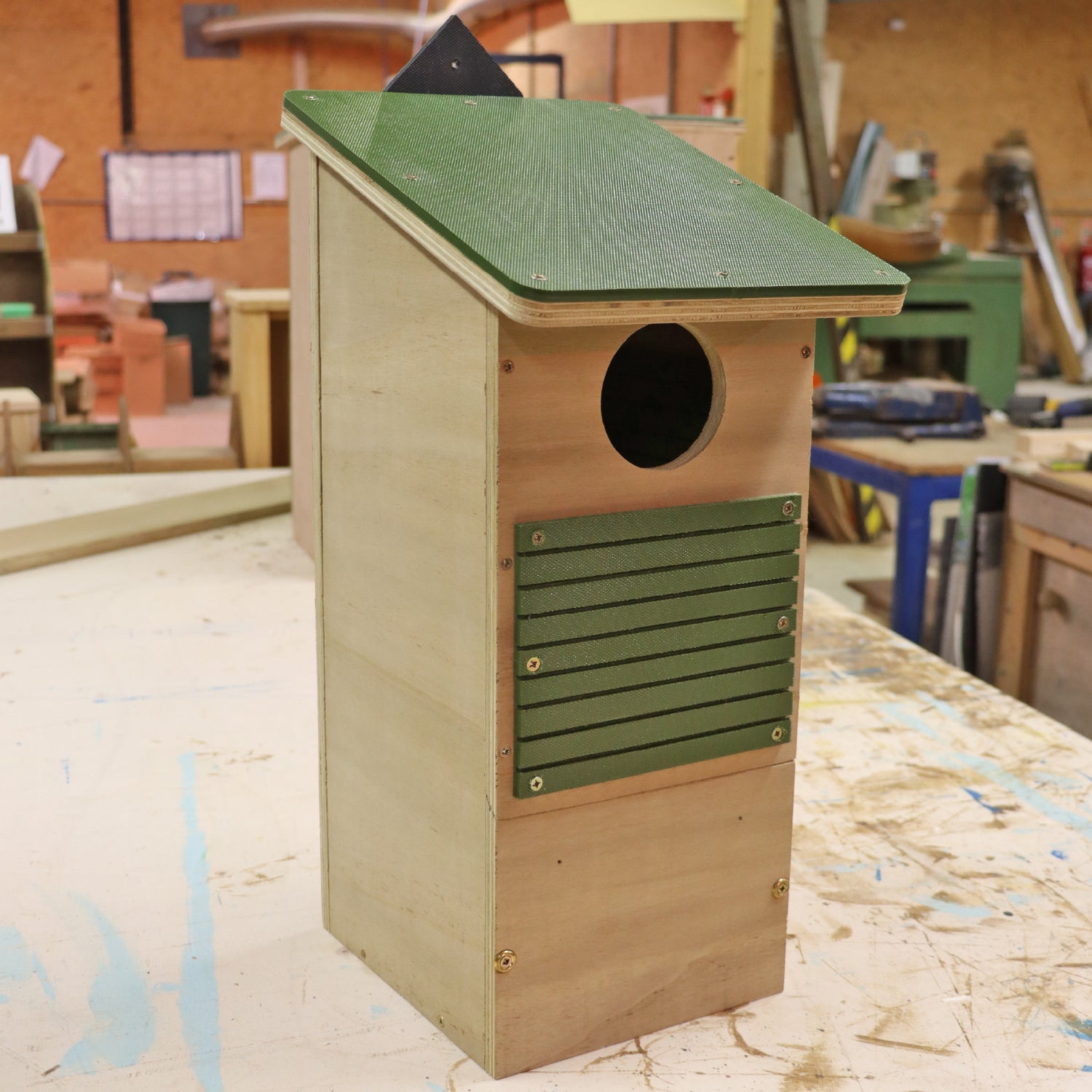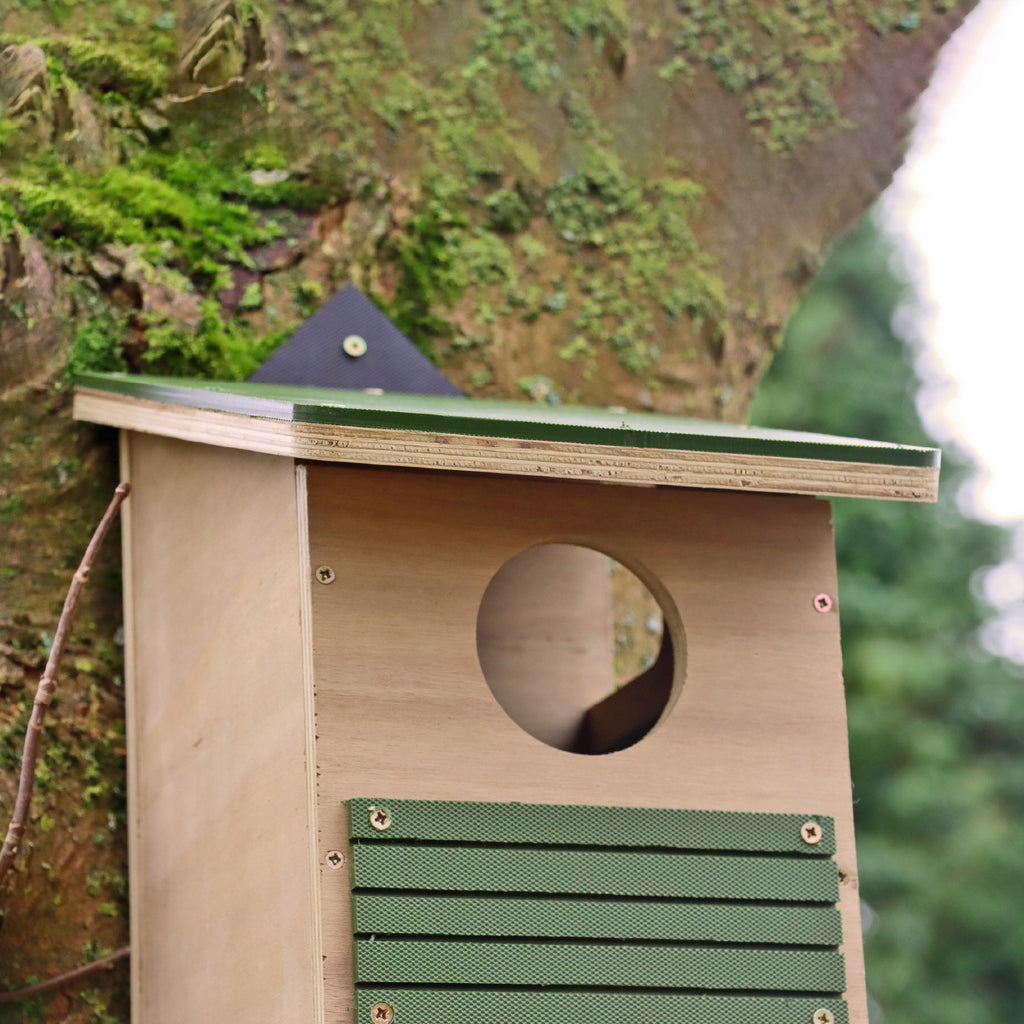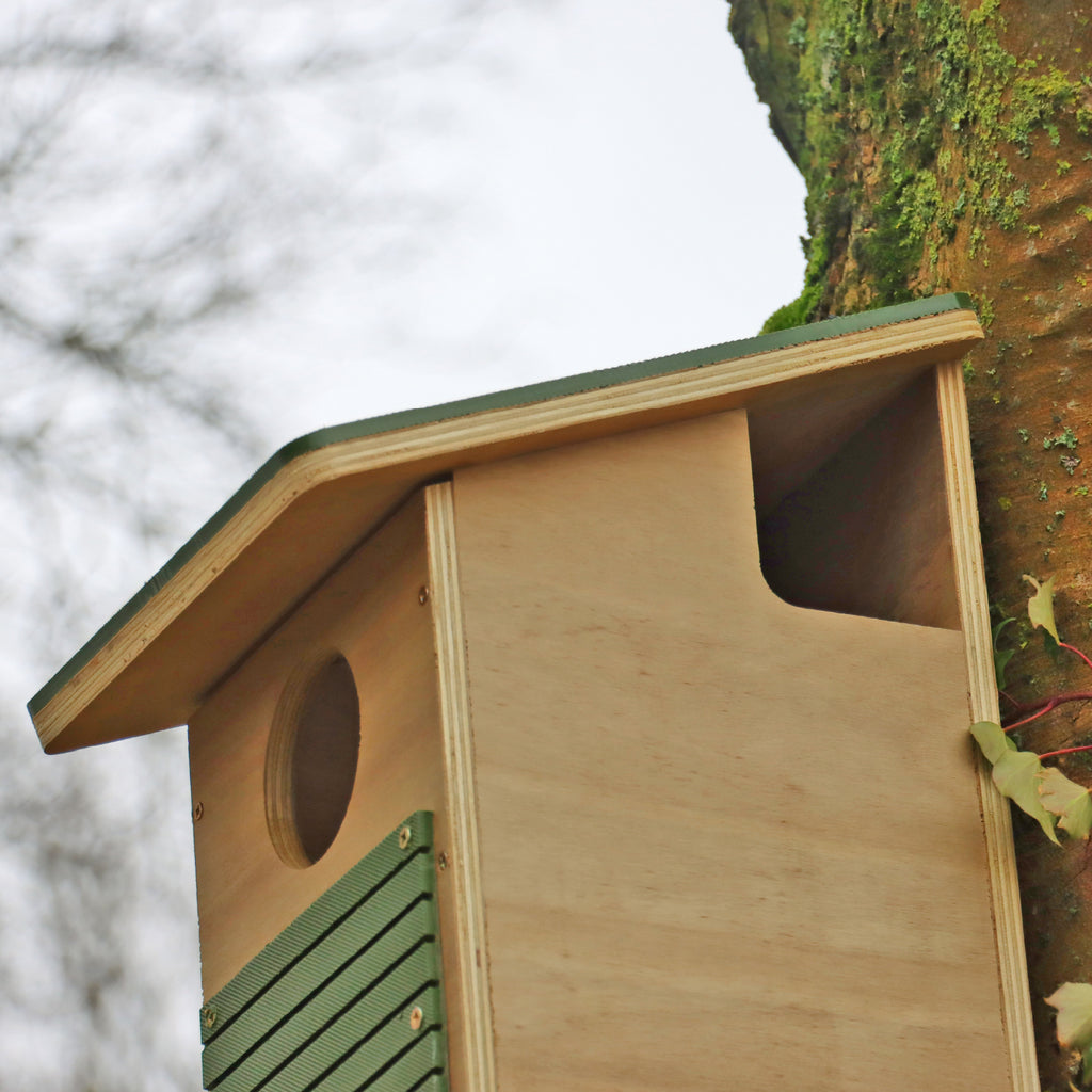 Equipped with two entrance/exit holes, an internal and external ladder facilitates the young squirrels in overcoming the slippery sides of the box. A thoughtful perching ledge enhances functionality, while a pitched roof made from recycled plastic ensures effective rain shedding, safeguarding the interior. For ease of maintenance, the nest box includes a removable front panel, allowing straightforward cleaning to ensure a comfortable and secure habitat for your furry friends.