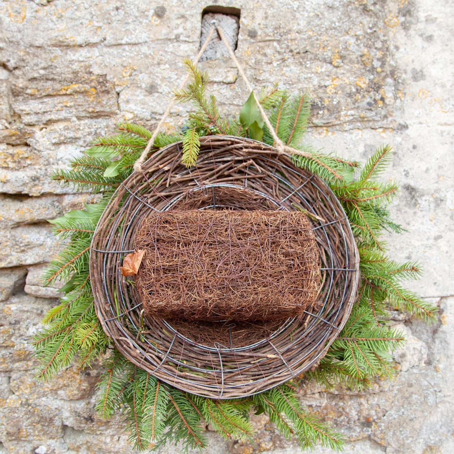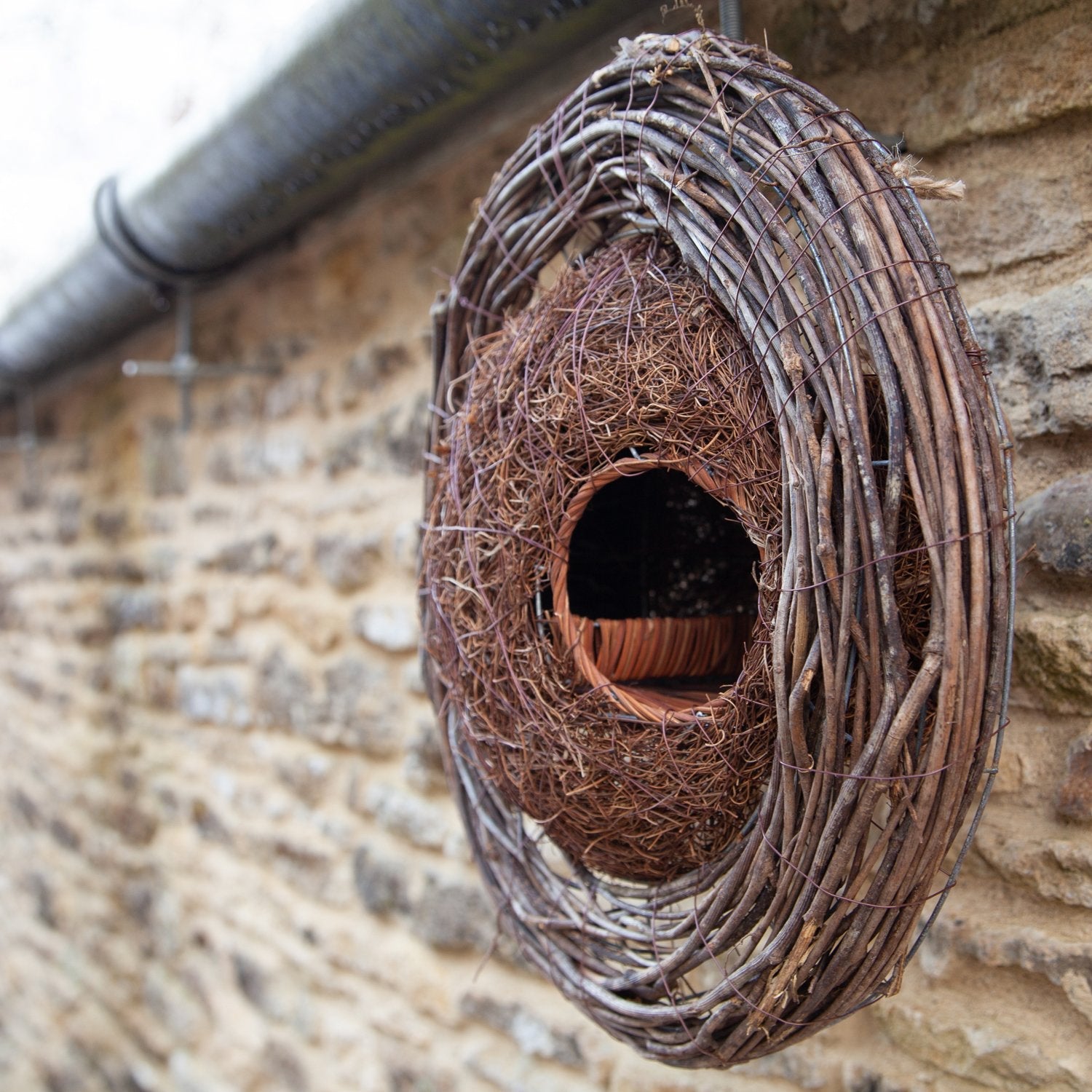 Attach the lightweight nester into hedges, ivy or trees using wire. Alternatively, attach the wreath to walls using the hanging string or supplied spare loop of fixing wire. The base of the brushwood nester has a rattan landing platform. A low dividing wall separates the nesting or roosting space.
